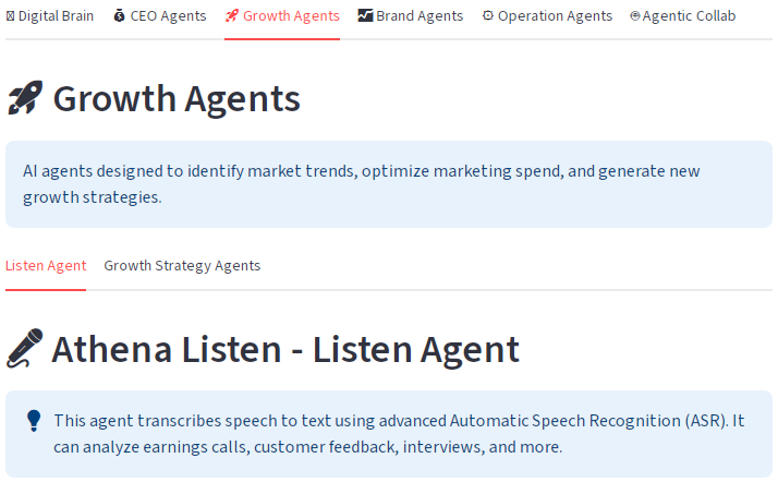 Athena read, write, listen, speak, see, watch models & agents are building blocks of CEO agents, capital agents, growth agents, operation agents, and agent-to-agent collaboration for accelerating enterprise AI adoption.